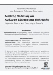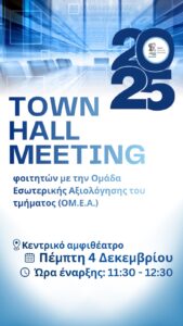 Πρόσκληση συμμετοχής στο TownHall Meeting Τμήματος Πολιτικής Επιστήμης με την ΟΜΕΑ του Τμήματος - Πέμπτη 4 Δεκεμβρίου στις 11.30πμ Αγαπητοί φοιτητές, Αγαπητά μέλη της ακαδημαϊκής κοινότητας, Σας προσκαλούμε στο πρώτο town hall meeting ανάμεσα στην Ομάδα Εσωτερικής Αξιολόγησης (ΟΜΕΑ) του Τμήματος Πολιτικής Επιστήμης και τους φοιτητές τους. Η συνάντηση διοργανώνεται σε συνεργασία με το Διοικητικό Συμβούλιο του Συλλόγου Φοιτητών “Μελίνα Μερκούρη”. Στόχος μας είναι να συζητήσουμε αδιαμεσολάβητα και άμεσα ζητήματα που αφορούν την διαδικασία αξιολόγησης του διδακτικού έργου και ο…